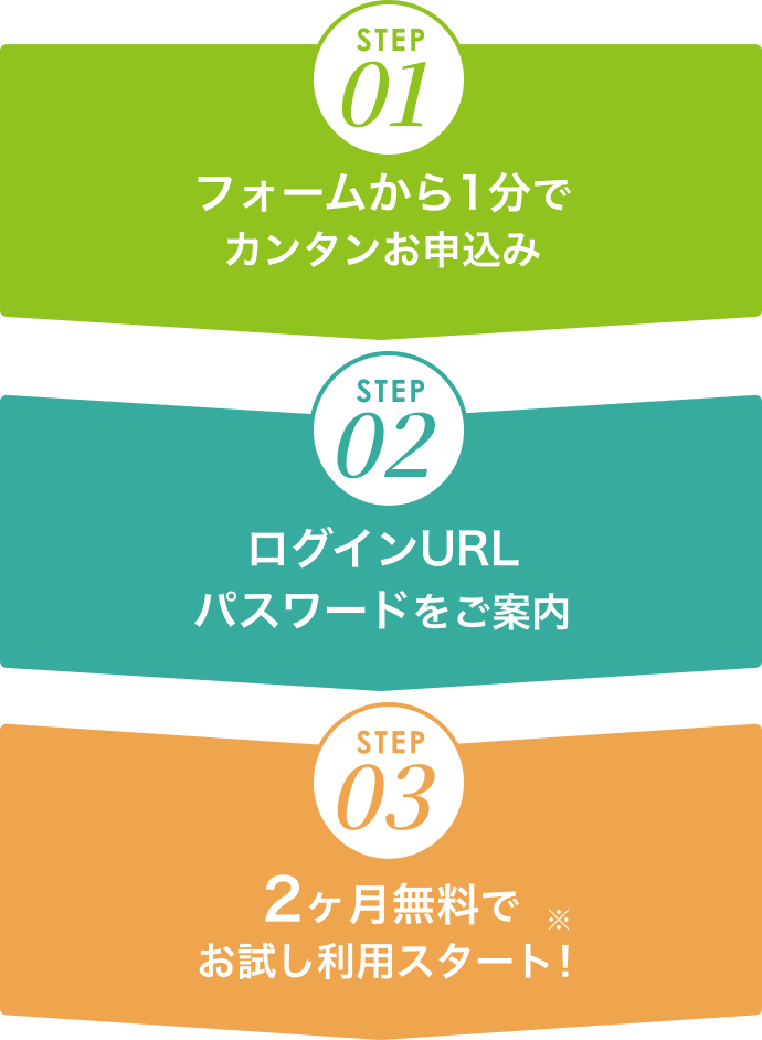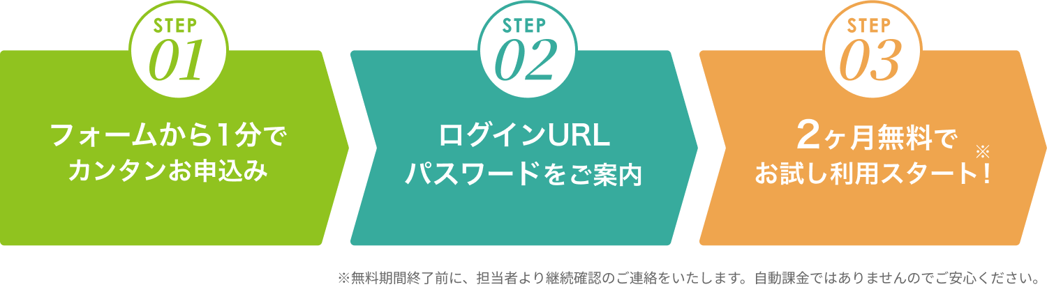 自動で課金はされませんのでご安心ください。必ず無料期間内に継続利用のご意向を確認させていただいております。お試し期間にご入力いただいたデータは本契約以降も引き継いでご利用いただけます。